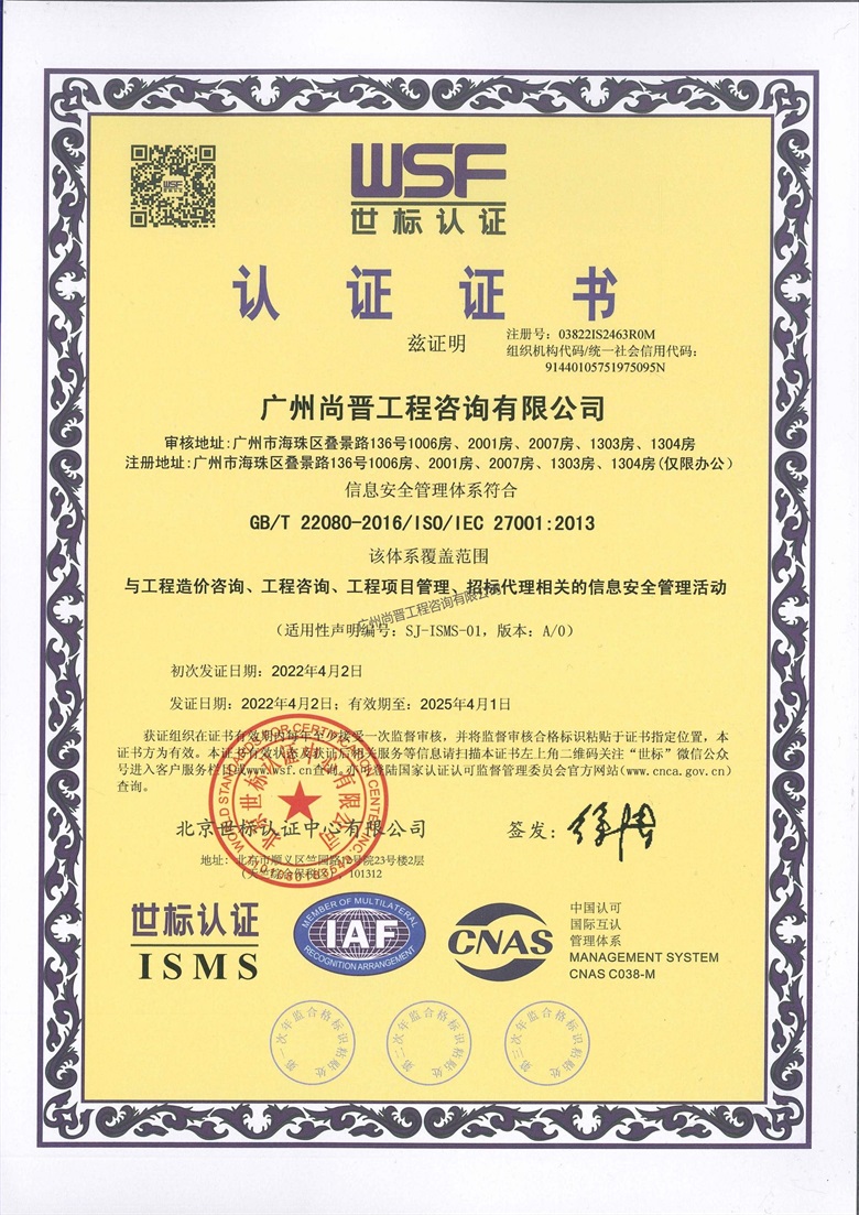 廣州尚晉工程咨詢有限公司(以下簡稱“尚晉咨詢“) 。具有建設部頒發的甲級工程造價咨詢資質、國家發展改革要頒發的工程項目管理資格證及廣東省工程建設招標代理資信A,是廣東省首批搭建大數據咨詢平臺進行全過程咨詢管控模式的公司之一,擔任廣東省工程造價協會理事單位、廣州市造價協會理事單位、廣東省建筑業協會理事單位等要職。     廣州尚晉工程...